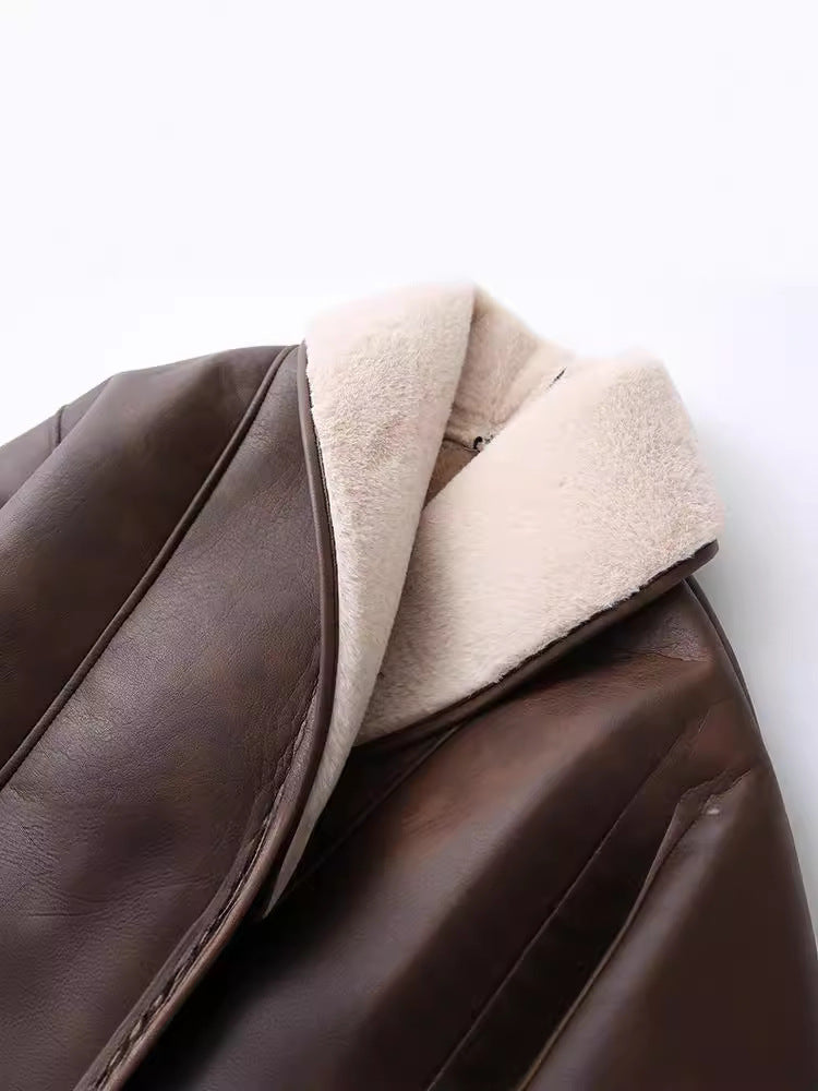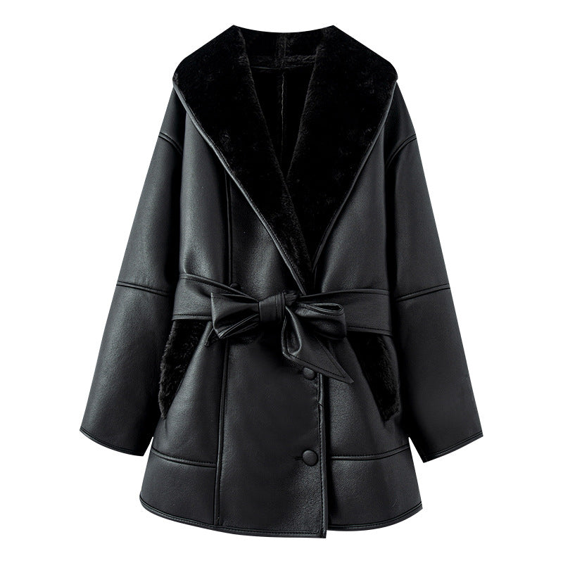Autumn And Winter New American Street Fashion Style Elegant Contrast Color Design Imitation Leather Jacket Warm Lace-up Mid-length Cotton-padded Coat